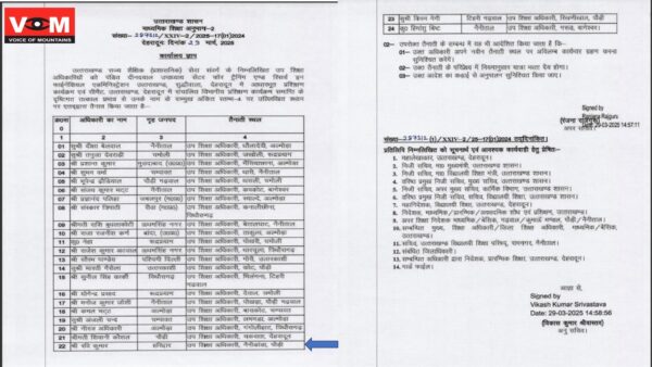उत्तराखंड पी सी एस उत्तीर्ण अभ्यर्थियों को आज नयी तैनाती कर दी गई है उत्तराखंड राज्य शैक्षिक ( प्रशासनिक) सेवा संवर्ग के अंतर्गत उप शिक्षा अधिकारियों को पंडित दीनदयाल उपाध्याय सेंटर फॉर ट्रेनिंग एंड रिसर्च इन फाइनेंसियल एडमिस्ट्रेशन उत्तराखंड सुद्धोवाला देहरादून में आधार भूत प्रशिक्षण एवं सीमेट देहरादून में संचालित विभागीय प्रशिक्षण समाप्ति के उपरांत 24 उप शिक्षा अधिकारी को तैनाती दी गई , ज्ञात हो कि प्रारंभिक शिक्षा के अंतर्गत प्रत्येक विकास खंड में 100-150 तक प्राथमिक विद्यालय एवं 25-30 तक जूनियर हाईस्कूल अंतर्गत आते हैं जिनका अनुश्रवण,वेतन, अवकाश, वित्तीय आदि उप शिक्षा अधिकारी के आधीन होता है दुर्गम क्षेत्रों में अधिकारियों के रिक्त पद होने के कारण अतिरिक्त प्रभार निकटतम विकास खंड को दिया जाता है वर्तमान में नैनी डांडा के खंड शिक्षा अधिकारी एवं उप शिक्षा अधिकारी का प्रभार बीरोंखाल के खंड शिक्षा अधिकारी वर्षा भारद्वाज के पास है जो कि गत वर्ष तत्कालीन खंड शिक्षा अधिकारी नैनी 18फरवरी 2024 से श्री अभिषेक शुक्ला जी के स्थानांतरण के उपरांत रिक्त हो गया था विभागीय नियमानुसार शैक्षिक प्रशासनिक गतिविधियों को सफल संचालन हेतु प्रत्येक विकास खंड में उप शिक्षा अधिकारी ( प्रारम्भिक शिक्षा) तथा खंड शिक्षा अधिकारी( माध्यमिक शिक्षा) का पद होना अति आवश्यक है अभी भी नैनी डांडा में खंड शिक्षा अधिकारी का पद रिक्त हैं लेकिन 24 नवनियुक्त अधिकारियों की तैनाती से दुर्गम क्षेत्रों की शिक्षा में परिवर्तन होगा लेकिन घटती छात्र संख्या चिंता का विषय बनी हुई है!