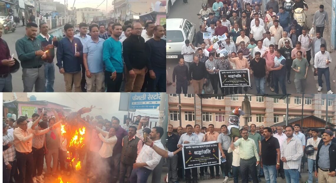 पहलगाम कश्मीर में पर्यटकों पर हुए आतंकवादी हमले के बाद 26 मासूमों की हत्या के बाद पूरे देश में बहुत गुस्सा एवं आक्रोश है। जहां चारों ओर इस आतंकी हमले की घोर भर्त्सना हो रही है वहीं विभिन्न प्रदर्शनों के माध्यम से लोग अपना गुस्सा जाहिर कर रहे हैं। इसी क्रम में पौड़ी मंडल मुख्यालय पर विभिन्न कर्मचारी संगठनों, व्यापार संघ एवं आम जनता ने एक कैंडल मार्च निकालते हुए पाकिस्तान के पुतले का दहन किया और पाकिस्तान को संदेश दिया कि देश पर इस प्रकार के हमले होने पर पूरा देश एक साथ खड़ा है। राष्ट्रीय पुरानी पेंशन बहाली संयुक्त मोर्चा के प्रदेश महासचिव सीताराम पोखरियाल ने भारत सरकार से अपील की है कि इस हमले का बदला तुरंत लिया जाए। सेवानिवृत्त कर्मचारी संगठन के सचिव जसपाल रावत ने कहा कि हमारा देश अखंड है और आतंकवाद को कभी भी सहन नहीं करेगा। व्यापार संघ के अध्यक्ष विनय शर्मा ने कहा कि ऐसा कुकृत्य कभी भी सहन नहीं होगा और इसके लिए भारत सरकार को अपने ओर से जल्दी पहल करते हुए देश और कश्मीर को संदेश देना होगा कि हमारा देश सुरक्षित है। राष्ट्रीय पुरानी पेंशन बहाली संयुक्त मोर्चा के प्रदेश अध्यक्ष जयदीप रावत ने कहा कि पाकिस्तान हर बार अपनी घिनौनी हरकत से अपना असली चेहरा दिखा रहा है। इसका जवाब दिया जाना चाहिए। इस अवसर पर व्यापर संघ पौड़ी के अध्यक्ष विनय शर्मा, देवेन्द्र सिंह रावत बिल्ला सचिव, दिलवर सिंह भण्डारी कोषाध्यक्ष, अरविंद नेगी सदस्य व्यापार संघ, अजीत नेगी, मनोज काला, रेवती नंदन डंगवाल अध्यक्ष फैडरेशन, संग्राम सिंह नेगी तहसील प्रभारी, संजय नेगी, राकेश रावत, मनोज भट्ट, इनायत हुसैन, त्रिभुवन उनियाल, प्रेम चंद्र ध्यानी, संतोष खण्डूरी, भवान सिंह नेगी आदि उपस्थित थे।