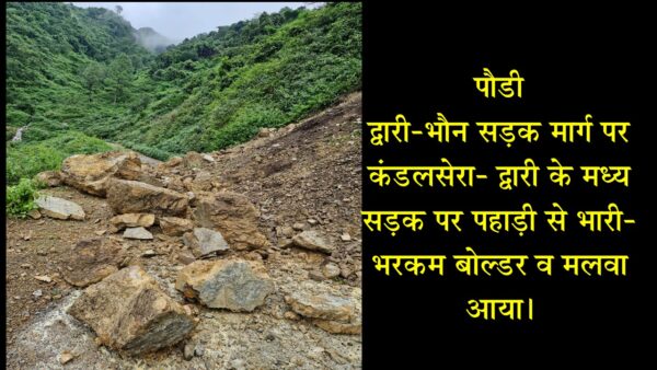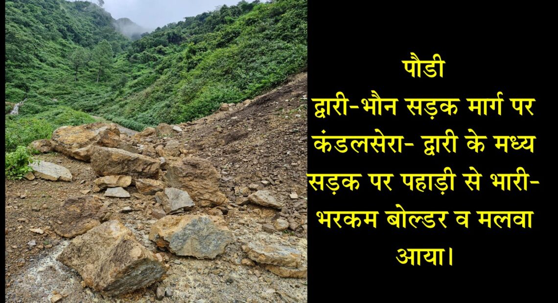 द्वारी-भौन सड़क मार्ग पर कंडलसेरा- द्वारी के मध्य सड़क पर पहाड़ी से भारी-भरकम बोल्डर व मलवा आया।