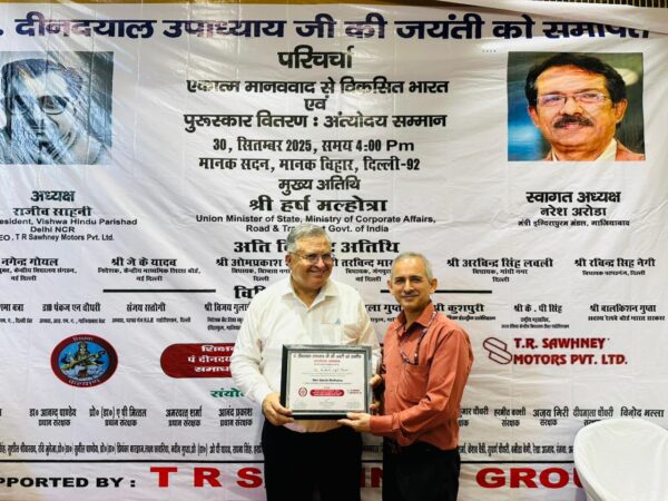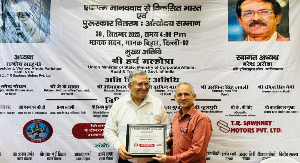 यह सम्मान श्री हर्ष मल्होत्रा, राज्य मंत्री (सड़क परिवहन एवं राजमार्ग एवं कॉर्पोरेट कार्य मंत्रालय) द्वारा शिक्षा सदन, सूरजमल विहार, नई दिल्ली में आयोजित भव्य समारोह में प्रदान किया गया। यह अवसर पं. विष्णु दयाल उपाध्याय जी की जयंती पर आयोजित किया गया।