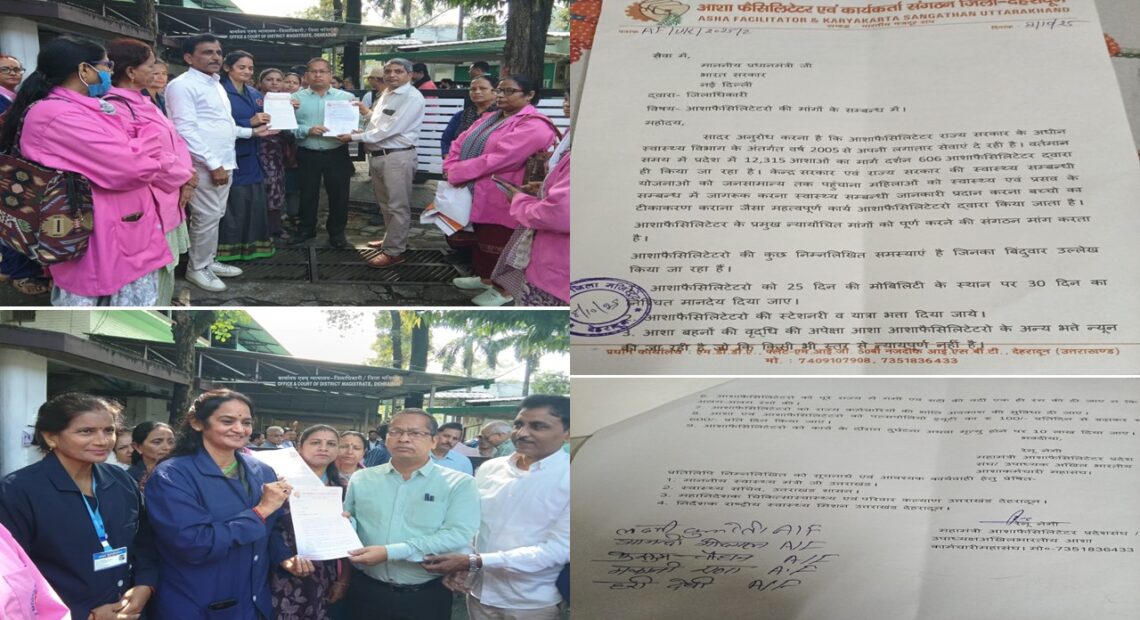 देहरादून- काफी लम्बे समय से आशाफैसिलिटेटरों की अपनी मांगो को लेकर लगातार राज्य सरकारो एंव केन्द्र से अपनी मांगो को करती आई है। समय समय पर धरना प्रदर्शन एंव ज्ञापन के माध्यम से राज्यों के मुख्यमंत्रीयों एंव केन्द्र को अपनी बात पहूंचाने का प्रयास किया है। आज अखिल भारतीय आशा कर्मचारी महासंघ के प्रदेश संगठन एंव आशा फैसिलेटटर एंव कार्यकर्ता संगठन जिला देहरादून ने बिभिन्न मांगो के निराकरण हेतू प्रधानमंत्री भारत सरकार एंव मुख्यमंत्री उततराखण्ड को ज्ञापन सौपा। देश भर मे सभी आशाफैसिलेटटरों द्वारा अपनी मांगो को लेकर जिला संगठनो द्वारा राज्यों के मुख्यमंत्रीयों एंव प्रधानमंत्री को ज्ञापन सौपा जा रहा है । संगठन की महामंत्री रेनू नेगी अखिल भारतीय आशा कर्मचारी महासंघ राष्टीय उपाध्यक्ष /आशा फैसिलेटटर प्रदेश महामंत्री ने बताया की हम का हम काफी समय से अपनेमानदेय यात्रा भाता एंव अन्य मांगो को लेकर सरकार से गुहार लगाते आ रहे है। उन्होने बताया की देश भी मे ज्ञापन जिलाधिकारी के माध्यम से भेजे जा रहे है।