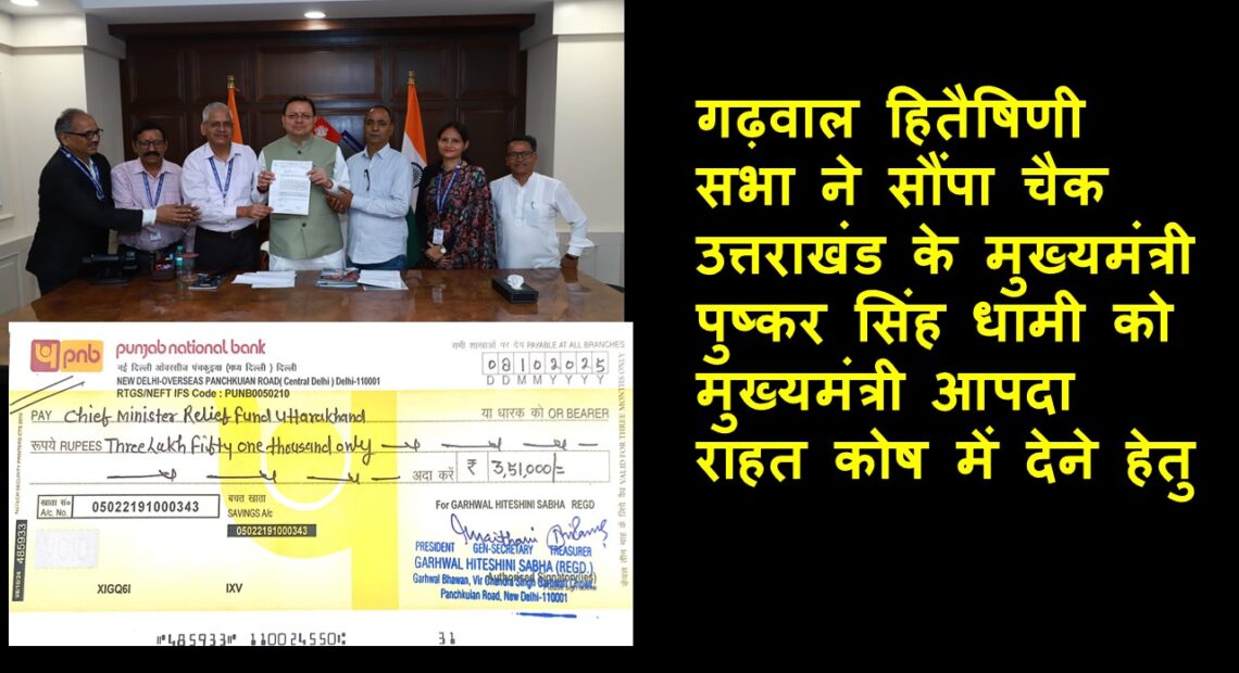 दिल्ली एनसीआर स्थित उत्तराखंड प्रवासियों की लब्ध-प्रतिष्ठित सामाजिक व वरिष्ठ सामाजिक संस्था गढ़वाल हितैषिणी सभा ने आज सभा अध्यक्ष श्री सूरत सिंह रावत व महासचिव श्री पवन कुमार मैठानी के नेतृत्व में उत्तराखंड के माननीय मुख्यमंत्री श्री पुष्कर सिंह धामी को चाणक्य पुरी स्थित उत्तराखंड निवास में अभी हाल ही में उत्तराखंड के विभिन्न क्षेत्रों मुख्य रूप से धराली व थराली में आयी प्राकृतिक आपदा में पीड़ित परिवारों की सहायतार्थ मुख्यमंत्री आपदा राहत कोष में तीन लाख इक्कावन हजार रुपए का चैक सौंपा।