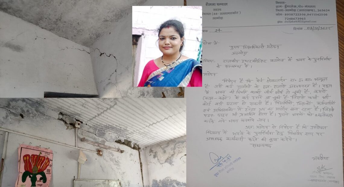 अल्मोडा-रा.ई.कॉंलेज भल्यूटा के भवन की छत की खस्ता हालत जिला पंचायत सदस्य शैलजा ने लगाई नवनिर्माण की गुहार।
