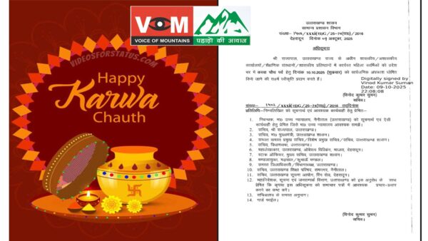 देहरादून- उत्तराखण्ड मे करवा चौथ पर अवकाश महिला कार्मिकों हेतु मात्र