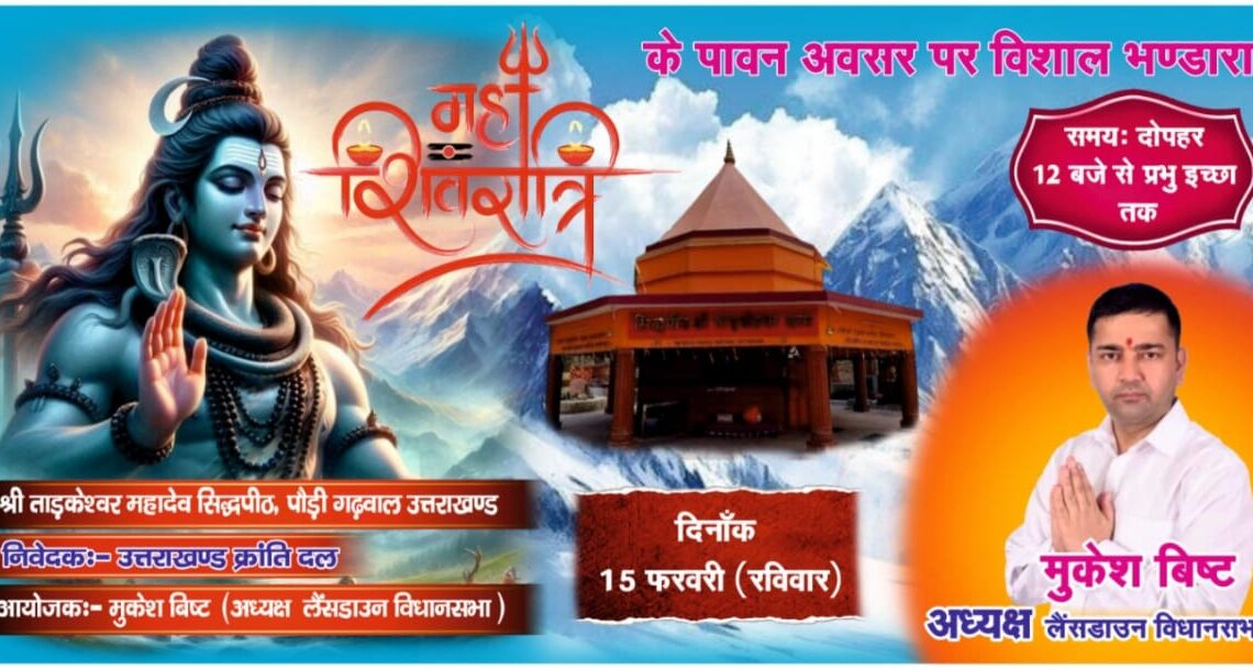 ​लैंसडाउन (पौड़ी गढ़वाल): देवभूमि उत्तराखंड के आराध्य भगवान शिव के पावन पर्व महाशिवरात्रि (15 फरवरी 2026) को लेकर इस वर्ष लैंसडाउन विधानसभा क्षेत्र में अभूतपूर्व उत्साह देखने को मिल रहा है। उत्तराखंड क्रांति दल (उक्रांद) के लोकप्रिय जनसेवक और युवा नेता, मुकेश बिष्ट के नेतृत्व में इस बार एक ऐतिहासिक धार्मिक आयोजन होने जा रहा है।